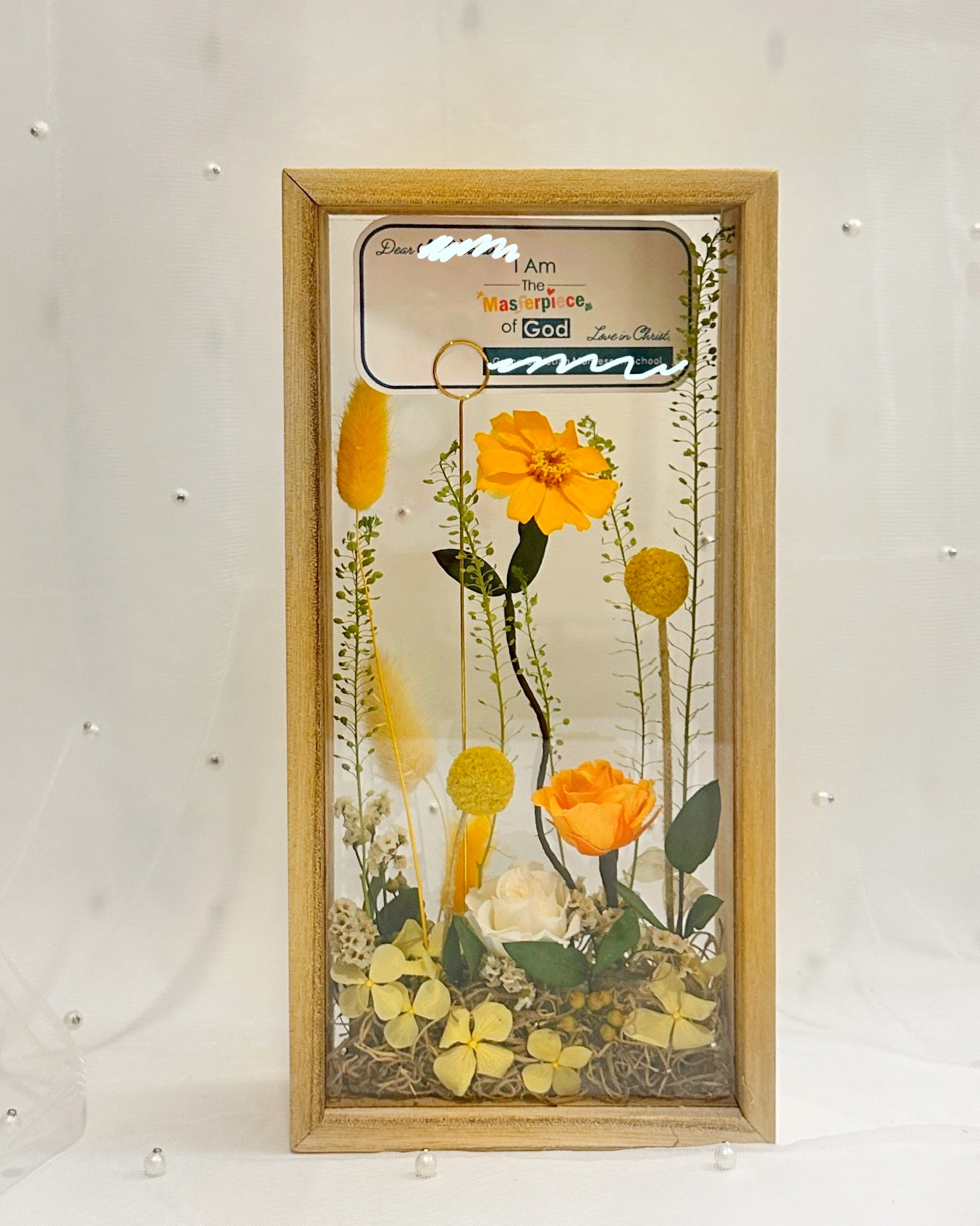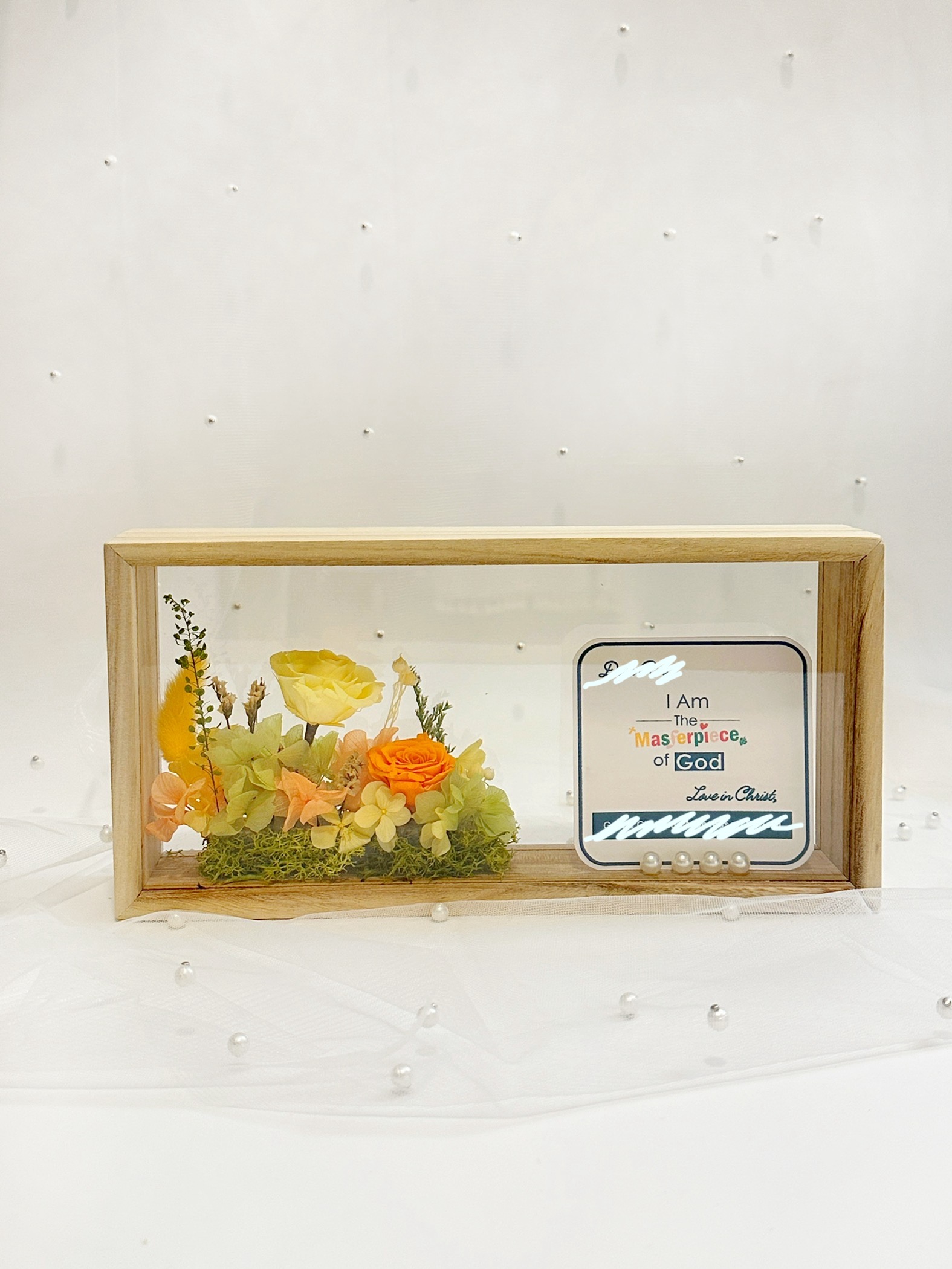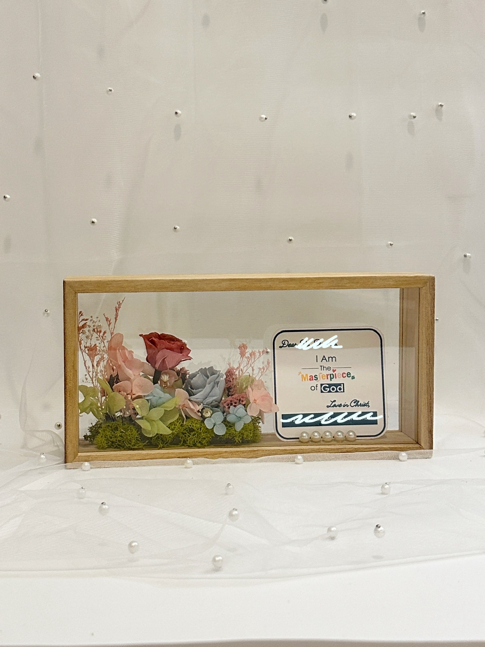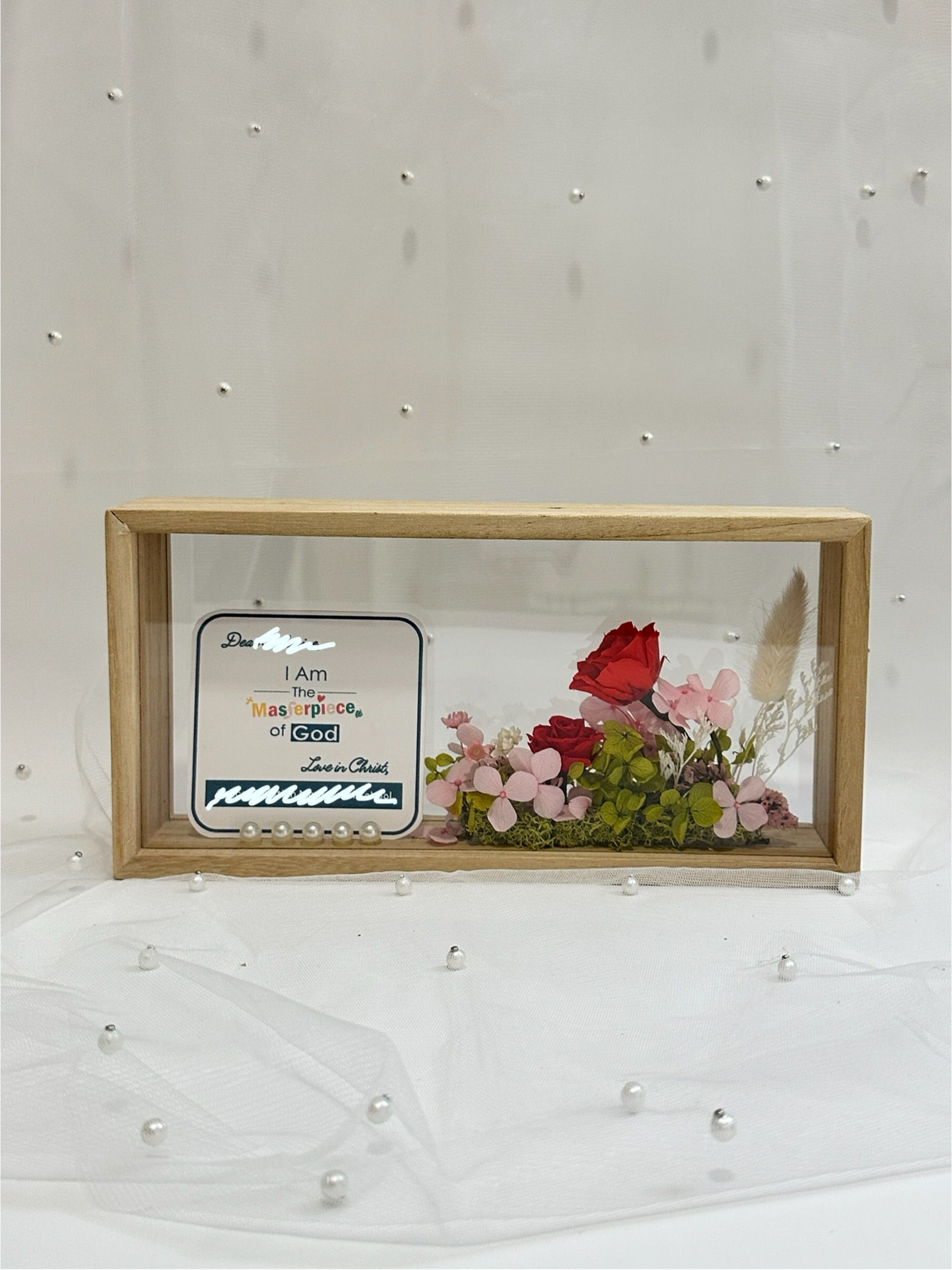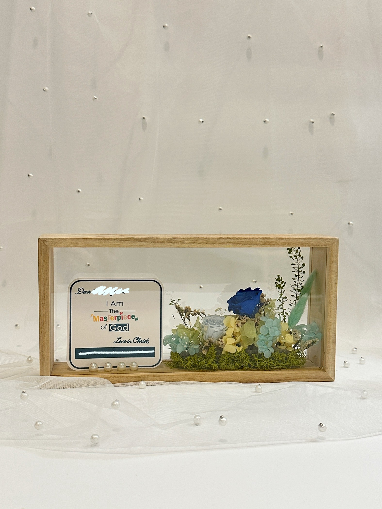 This is an arrangement features preserved roses, hydrangeas, and delicate accent plants in a two-sided transparent shadow box along with a card holder to place your favourite quote. It can be viewed from both sides.